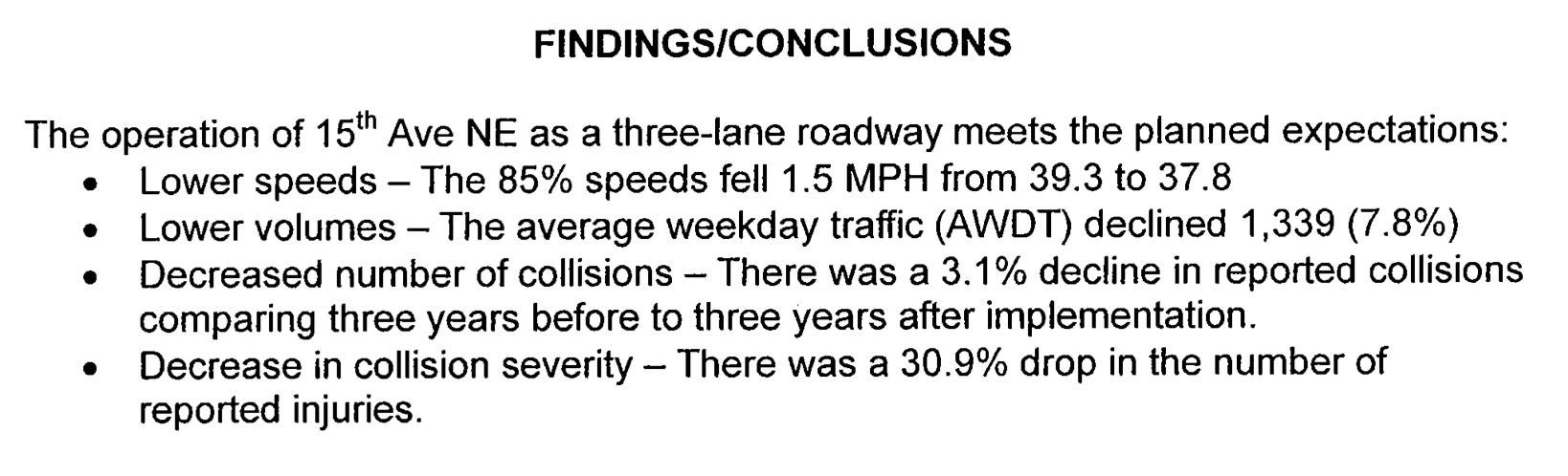 A study from 2007 found the road diet resulted in slower speeds, decreased traffic volumes, fewer crashes, and a 30.9% drop in the number of injury collisions.