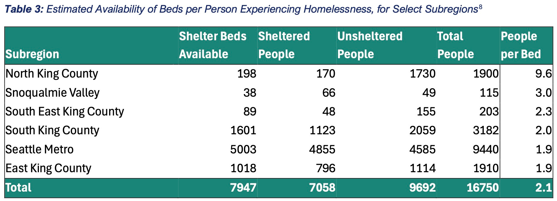 North King County has the worst homeless shelter shortage in the county. The agency reported 1,730 unsheltered homeless people in North King County last year but only 198 shelter beds available, a ratio of 9.6 unsheltered people per shelter bed— the worst ratio in the county. The county-wide average was 2.1 unsheltered people for each available bed.