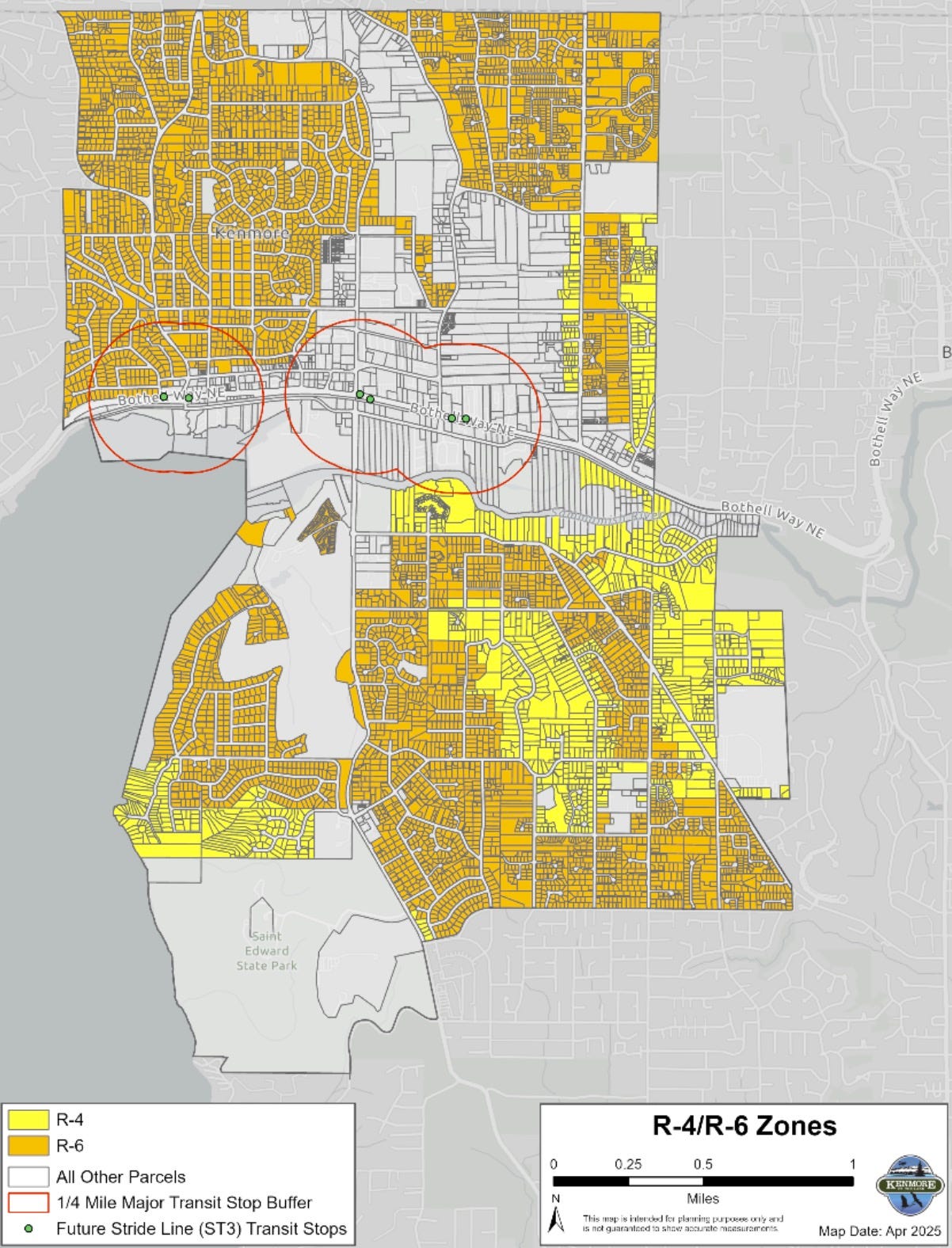 Like cities across the state, Kenmore must update its code to allow “Middle Housing” in neighborhoods that previously allowed only single-family homes. Under state law, cities must allow at least two homes per lot and up to four units if one is affordable. Near a transit stop, the allowed density increases to four units with up to six units allowed if one is affordable.