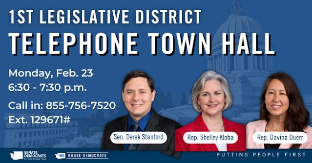 In the 1st legislative district, Sen. Derek Stanford, Rep. Shelley Kloba, and Rep. Davina Duerr will hold a Town Hall on Monday, Feb. 23, at 6:30 p.m. Call 855-756-7520 extension 129671# to attend.