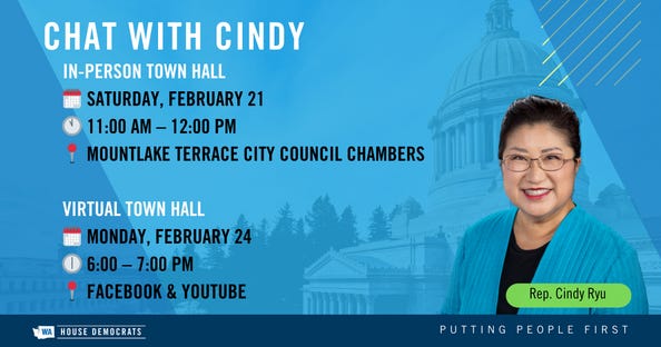 Tuesday, Feb. 24, 6 p.m. — Rep. Cindy Ryu, Virtual Town Hall on YouTube and Facebook