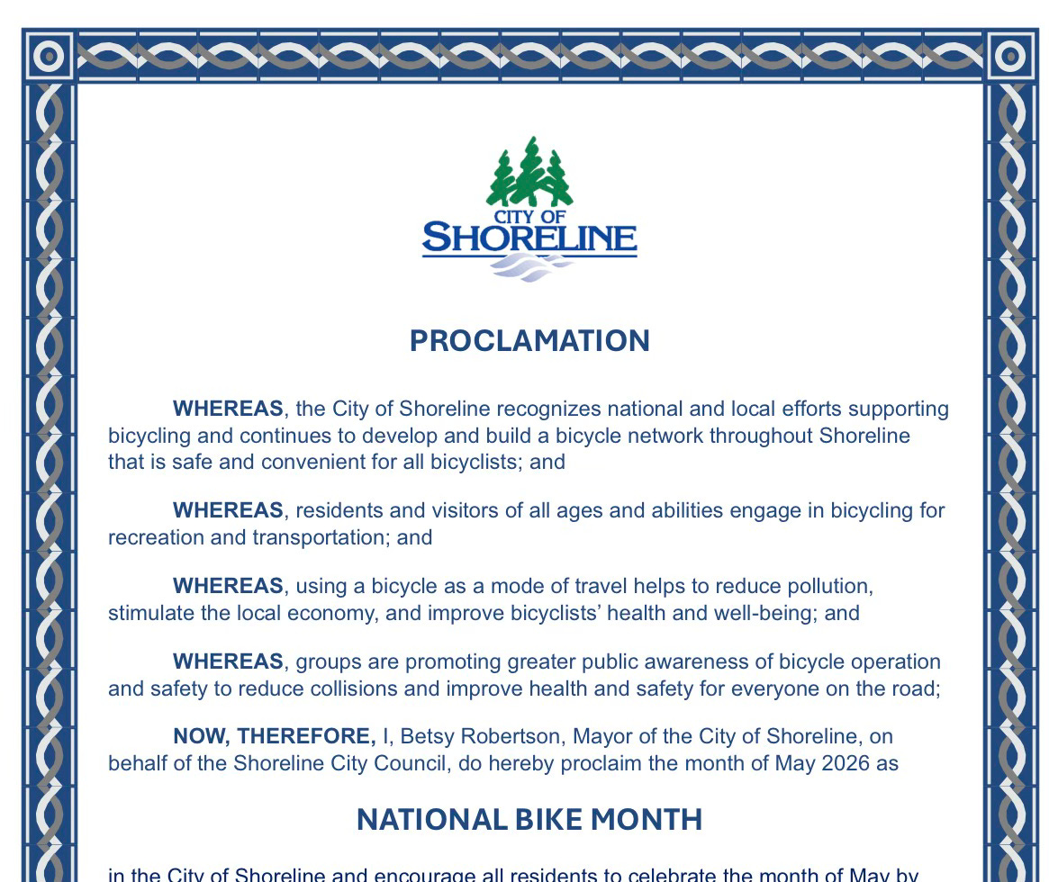 The Shoreline council will proclaim May National Bike Month at the Monday, May 4, 2026 meeting, followed by a public hearing on the 6-year Transportation Improvement Plan (TIP).