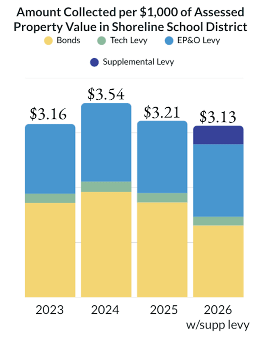 Even if voters pass the supplemental levy, the total Shoreline School District tax rate for property owners in 2026 would be about $3.13 per $1,000 of assessed property value, down from $3.21 this year. A median-valued home in the district is about $810,000, translating to about $2,535 in 2026, down from about $2,599 in 2025.